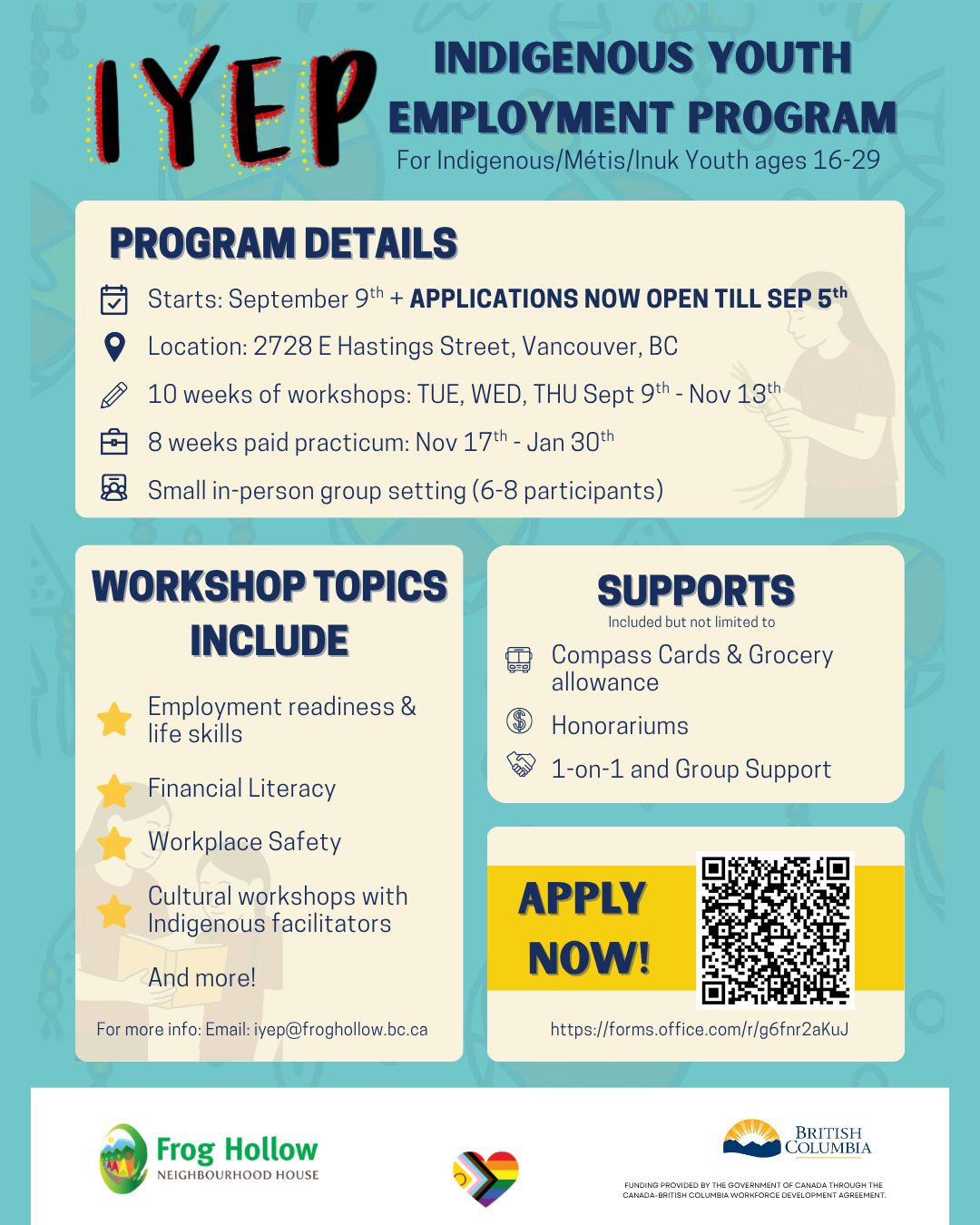 The Indigenous Youth Employment Program is for Indigenous youth aged 16-29. Participants will receive 1-to-1 mentorship, and attend a variety of workshops for developing pre-employment and employment skills. Transit passes, participation honorariums, paid placements, grocery allowances, and other supports are provided. Email IYEP@froghollow.bc.ca to learn more or apply.